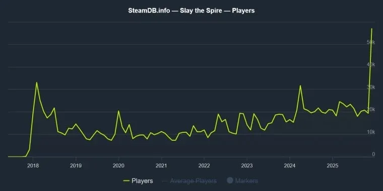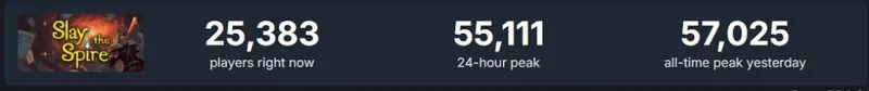 在发售近七年后,卡牌肉鸽游戏《杀戮尖塔》在Steam平台上同时在线玩家数量创下了新记录。部分原因是冬季促销的游戏特惠,而部分原因也可能是社交媒体上经常出现的“战未来”、“机宝”、等杀戮尖塔的梗。