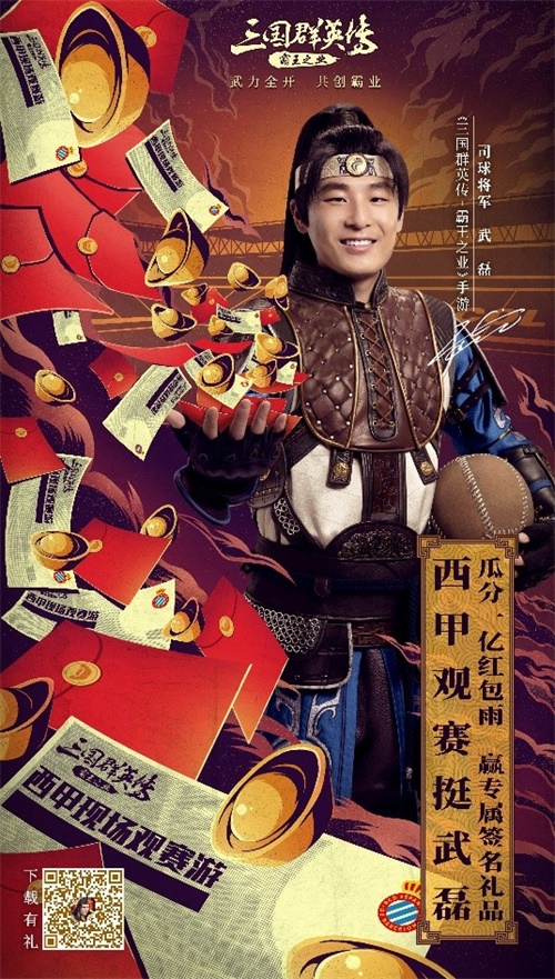 除了参与活动外,《三国群英传-霸王之业》官方还为各位主公准备了简单粗暴的福利回馈!活动期间每天登录游戏就能获得天赋秘策、亲密度道具、珍宝鉴、缘分宝物残卷等珍贵奖励,在每一次武磊上场,游戏内更是会直接发放1.8亿元宝红包,由所有主公拼手气瓜分!如果该场比赛武磊进球并获胜了,红包数额将升级为3.8亿元宝!