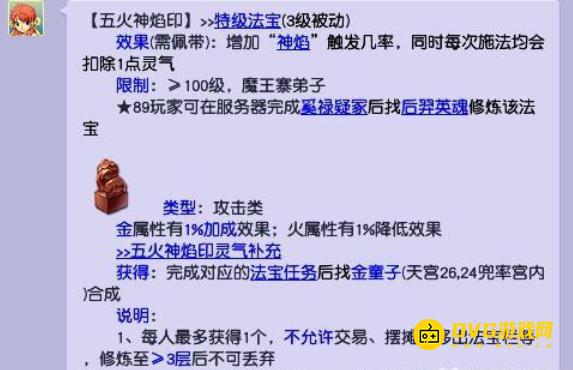 1.五火神焰印:该法宝可以增加“神焰”触发几率,同时每次施法均会扣除1点灵气,是魔王的门派法宝