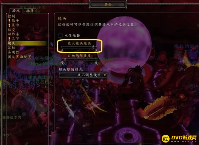 1、进入游戏,按esc键调出主菜单,选择界面这个选项,进入界面后选择镜头这个选项,在设置窗口点击右边的镜头跟随模式,在镜头模式里选择从不调整镜头这个选项,在把最大镜头距离拉到最远点保存即可。