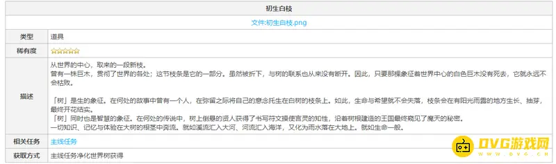 初生白枝是3.2版本新增上线的一个任务道具,同时也是须弥任务的奖励物品,解锁专属任务即可领取;需要将须弥第三章第五幕虚空鼓动的任务解锁,将这个任务解锁后才可以领取;解锁魔神任务之后,在劫火高扬任务的请饮下祝胜之酒活动中获取到该奖励物品。