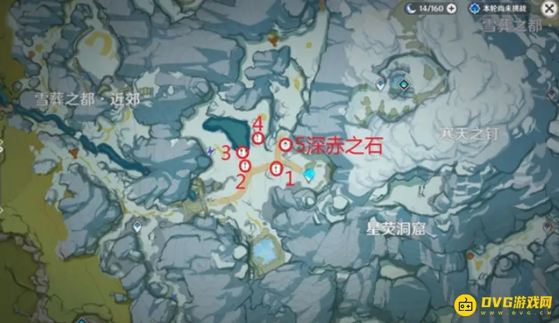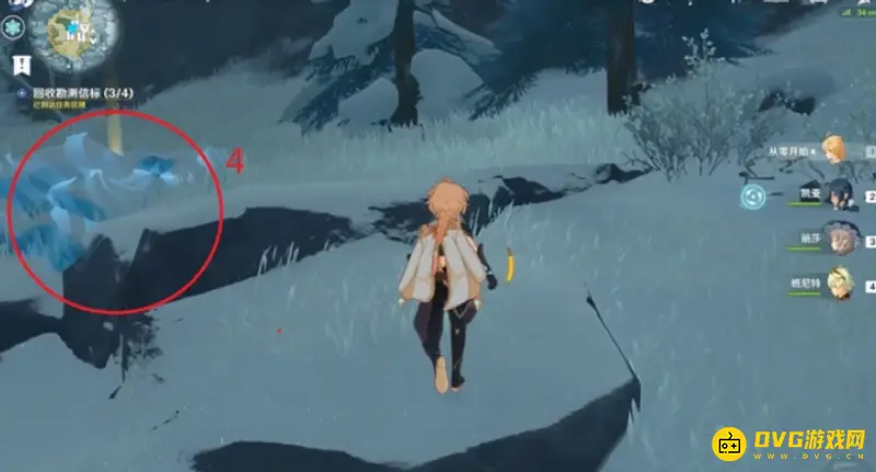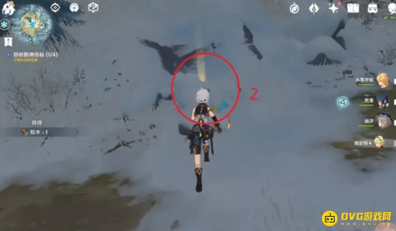 4、回收点1信标后继续往左走就可以看到一块发光的冰块就是点2,用火属性角色攻击就可以回收信标。