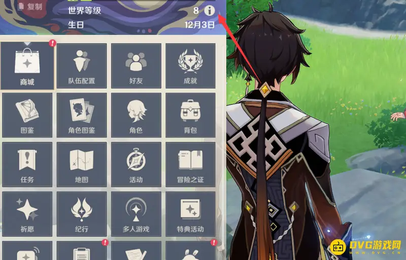 首先点击左上角来到派蒙界面中,在名片位置的世界等级旁边点击感叹号图标。