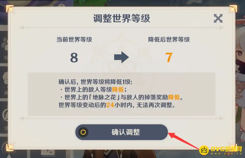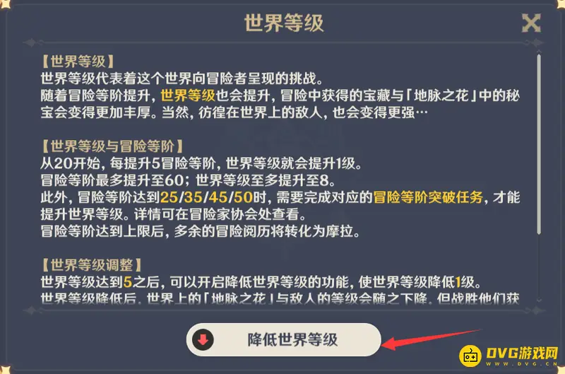 在弹出的界面下方就可以选择降低世界等级了,选择确认调整后就能够降低自己当前的世界等级了。