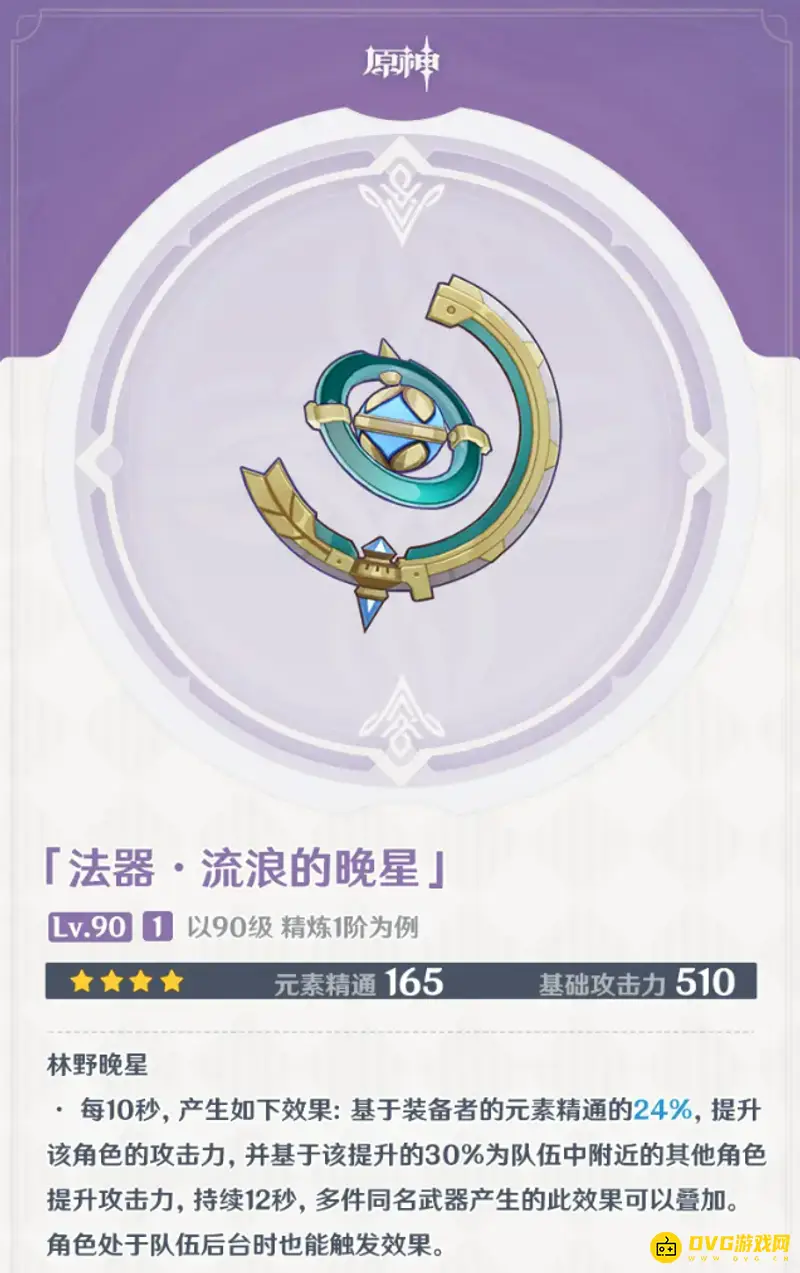 该武器只能通过祈愿获得。林野晚星:每10秒产生如下效果:基于装备者的元素精通的24%,提升该角色的攻击力,并基于该提升的30%为队伍中附近的其他角色提升攻击力,持续12秒,多件同名武器产生的此效果可以叠加。角色处于队伍后台时也能触发效果。