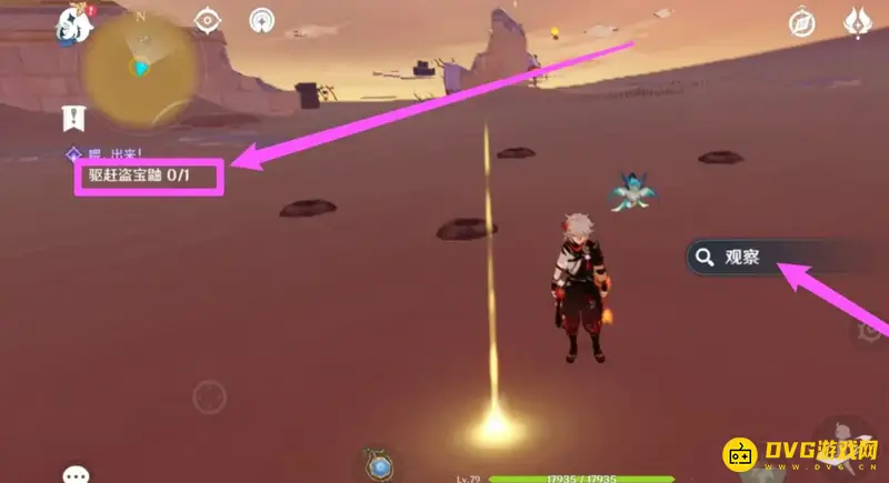 1、进入游戏界面,然后点击左侧的驱赶盗宝鼬,点击观察。