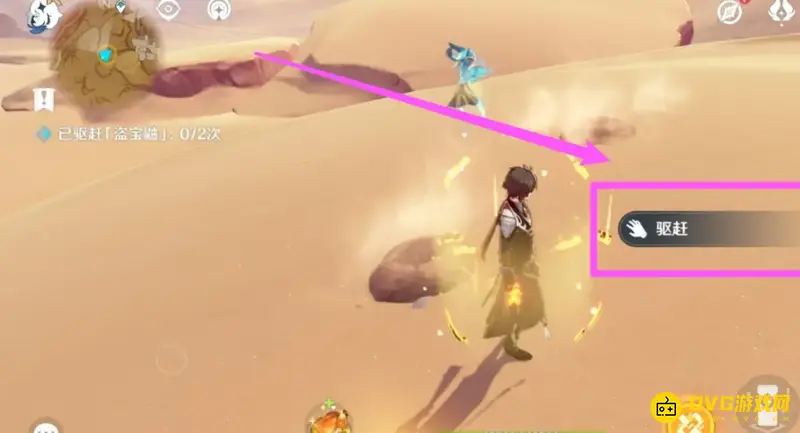 首先因为盗宝鼬的体型比较小,我们在沙漠里面看不清楚,所以在角色选择方面我们也选体型小,速度快的角色。然后我们观察盗宝鼬的沙子移动轨迹,找到洞口就可以直接抓住盗宝鼬了。