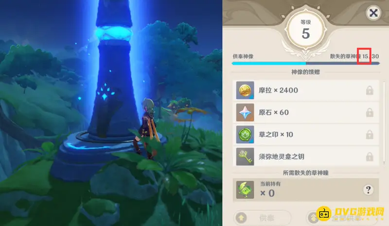 还剩15个草神瞳。如下图所示,供奉拿到的110个草神瞳后,可以将草七天神像的等级提升到五级,并且多了15个草神瞳。
