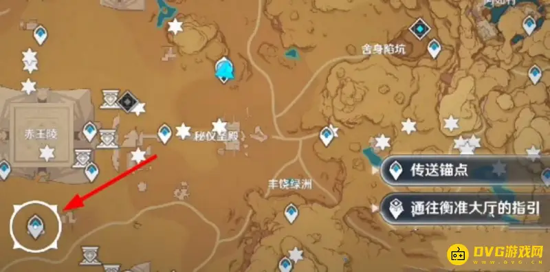 1、我们打开须弥沙漠地图,找到下图的传送点,点击会有额外的【通往衡准大厅的指引】,点击传送。