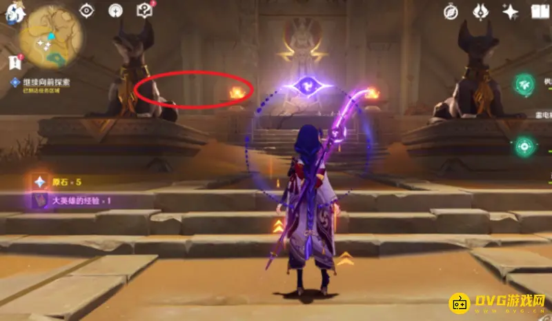 7、看到三乘种子票到右侧破碎的火炬位置时,使用雷元素激化三相众物,让火炬现形,点燃所有的火把,将机关封印;