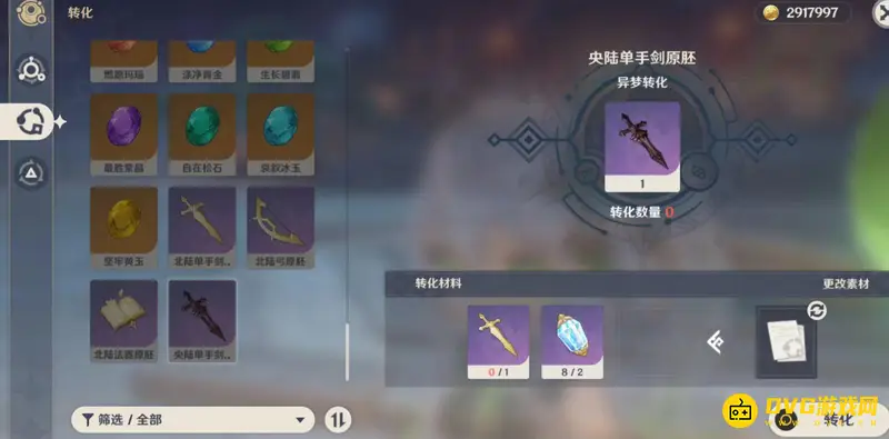 3、单手剑原胚转换。在合成台进行转换。