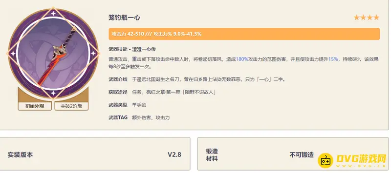 一般。笼钓瓶一心是标准的510白值副属性为百分比攻击力。自带15%的百分比攻击力加成,武器特效非常容易触发,可以认为这个特效常驻。(当然对于后台输出角色就没有办法触发这个特效了)。遗憾的是这个特效在四星武器里非常一般,只能说是一把非常普通的单手剑。