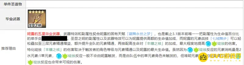 妮露专武能提供66.15% 20%=86.15%生命值,按照带生生生5万血妮露来算,武器特效还能为妮露180元素精通,给队友100元素精通,草种子的增伤效果非常显著。妮露专武武器特效和副属性契合妮露的固有天赋「翩舞永世之梦」,也是截止3.1版本前唯一一把副属性为生命值百分比的单手剑。