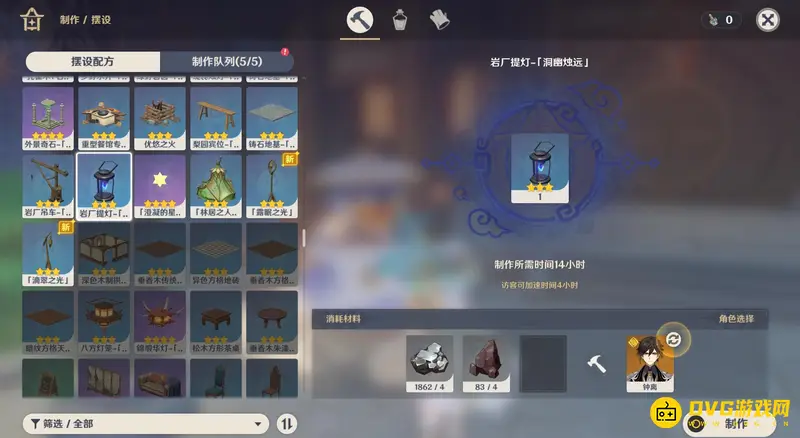 4、在制作摆设页面学习刚刚获得的图纸,掌握岩厂提灯的制作方式,消耗4个白铁块和4个铁块后就可以制作了,制作完成就能获得岩厂提灯-洞幽烛远。