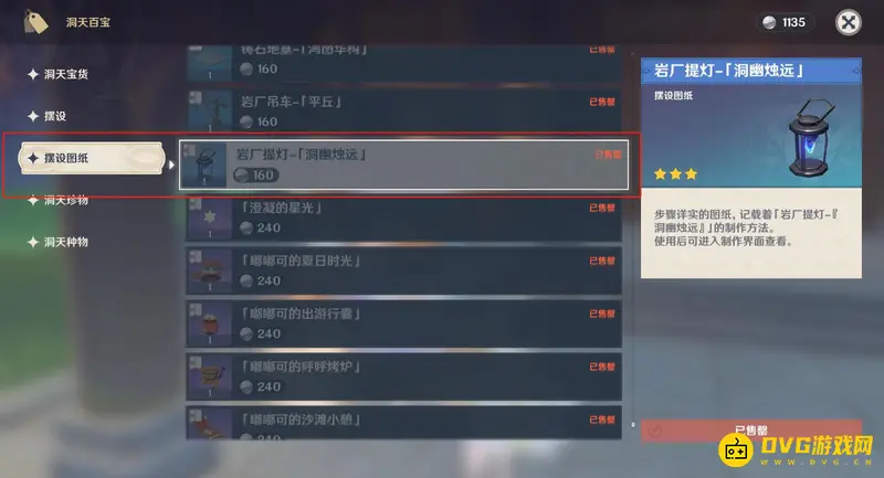 2、在洞天百宝的摆设图纸列表内找到岩厂提灯-洞幽烛远的制作图纸,消耗160个洞天宝钱兑换。