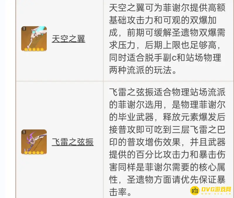 1,在原神的3.2版本中,皇女的五星武器推荐飞雷和天空之翼。天空之翼是首选武器,他能为菲谢尔提供高额基础攻击力和可观的双爆加成,前期可缓解圣遗物双爆需求压力,后期上限也足够高,同时适合脱手副c和站场物理两种流派的玩法。飞雷之弦振适合物理站场流派的菲谢尔选用,是物理菲谢尔的毕业武器,释放元素爆发后接普攻即可吃到三层飞雷之巴印的普攻增伤效果。