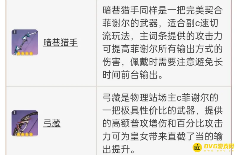 3,如果没有上面两把武器的话就选择暗巷猎手和弓藏。暗巷猎手同样是一把完美契合菲谢尔的武器,适合副c速切流玩法,主词条提供的攻击力可提高菲谢尔所有输出方式的伤害,佩戴时需要注意避免长时间前台输出。弓藏是物理站场主c菲谢尔的一把极具性价比的武器,提供的高额普攻增伤和百分比攻击力可为皇女带来直截了当的输出提升。