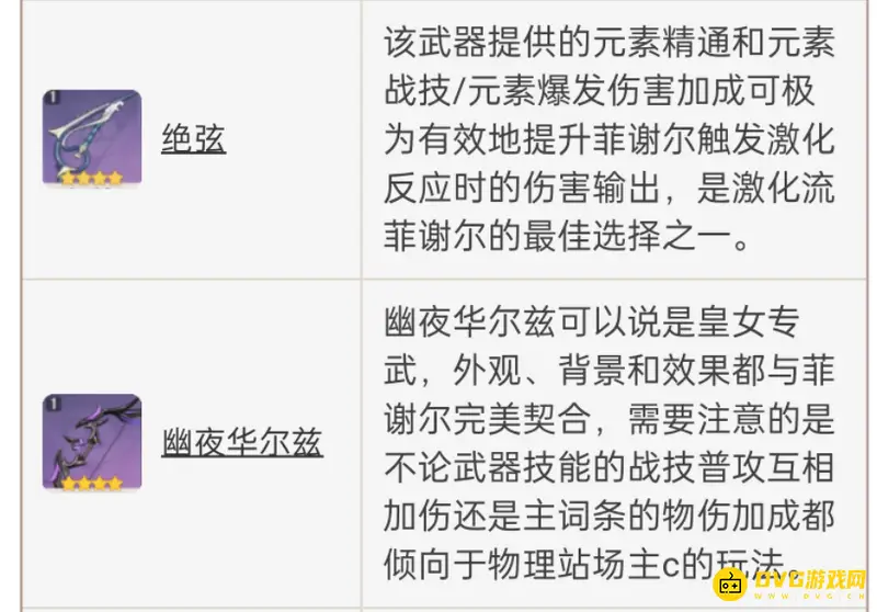 2,四星武器中推荐绝弦,幽夜华尔兹,暗巷猎手和弓藏。其中绝弦为首选四星武器,该武器提供的元素精通和元素战技/元素爆发伤害加成可极为有效地提升菲谢尔触发激化反应时的伤害输出,是激化流菲谢尔的最佳选择之一。而幽夜华尔兹可以说是皇女专武,外观、背景和效果都与菲谢尔完美契合,需要注意的是主词条的物伤加成是倾向于物理站场主c的玩法。