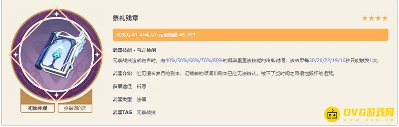 祭礼残章拥有四星级别法器里高达221点元素精通副属性,可惜武器特效对于元素战技「所闻遍计」极短的冷却时间没什么作用。