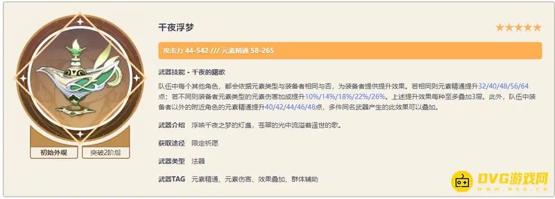 千夜浮梦:纳西妲的五星毕业武器,外观和武器特效契合纳西妲。该武器满级副属性提供高达265点元素精通。武器特效可为纳西妲自身提供元素伤害加成并为全队提供元素精通。武器特效提供的元素精通能否被二次转化待编辑。