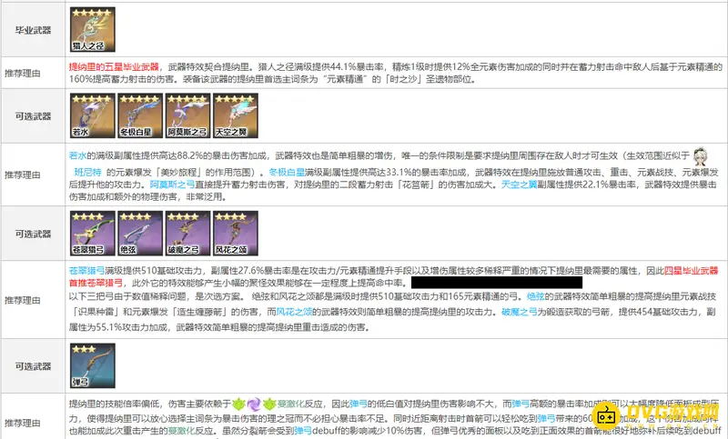 提纳里的技能倍率偏低,伤害主要依赖于蔓激化反应,因此弹弓的低白值对提纳里伤害影响不大,而弹弓高额的暴击率加成则可以大幅度降低面板成型压力,使得提纳里可以放心选择主词条为暴击伤害的理之冠而不必担心暴击率不足。同时近距离射击时首箭可以轻松吃到弹弓带来的60%伤害加成,这个伤害加成同样也能加成此次重击产生的蔓激化反应。