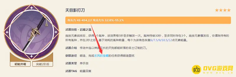 原神天目影打刀需要完成农民的宝藏的任务获得锻造图纸,然后去铁匠铺进行打造即可。天目影打刀基础属性为:攻击力41-454,攻击力% 12.0%-55.1%。