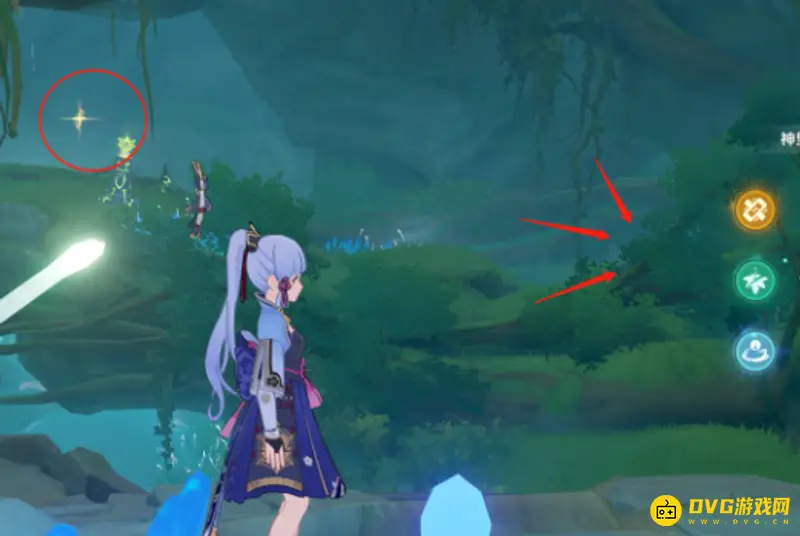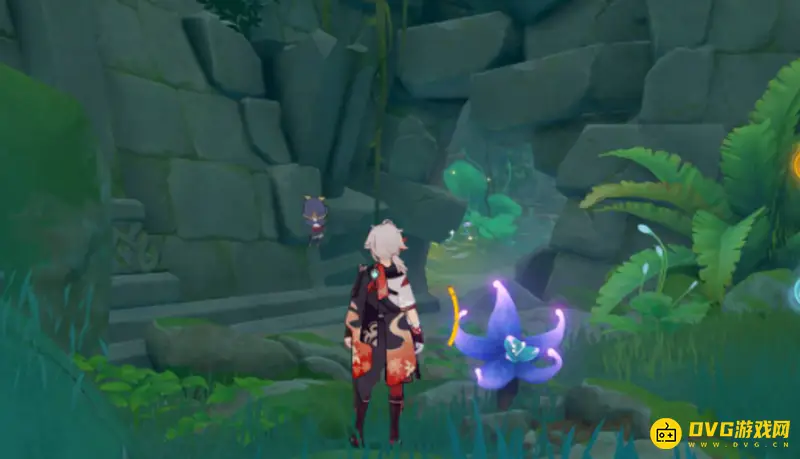 二、用四方印前往右下角的遗迹,能看见幽闭花,使用老旧的诗琴弹奏,如下图所示。