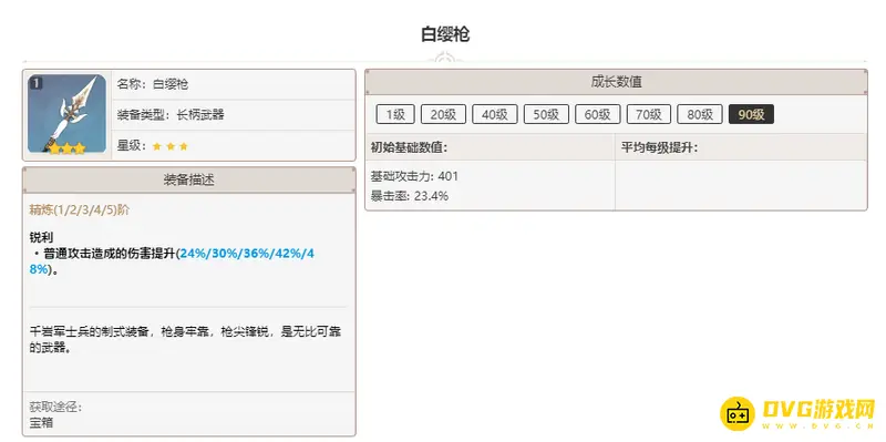 白缨枪满级属性是基础攻击力401点,暴击率加成23.4%。这把武器的精炼效果是增加普通攻击造成的伤害,在精炼一的情况下,普通攻击造成的伤害会提升24%,该效果与武器等级无关,之和精炼等级有关,要是精炼到等级五的时候,普通攻击造成的伤害就会提升到48%。