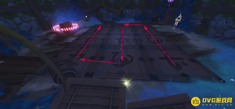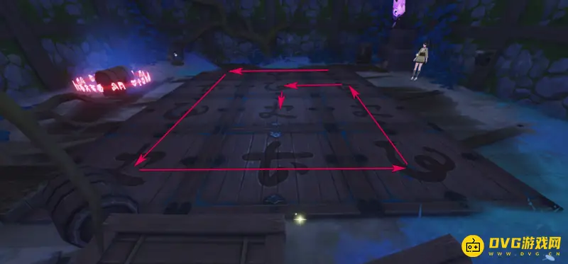 与外面简单的三块地板不同,这次需要我们在顺序不乱的情况下,一笔画点亮所有地板,这里我们举一种顺序为例,按照下图箭头顺序踩机关即可。