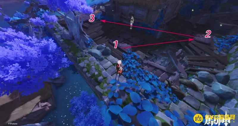 开关就位于越石村最南边,在藤原俊子身后的屋子墙壁上,直接从当前位置出发跑过去就可以。