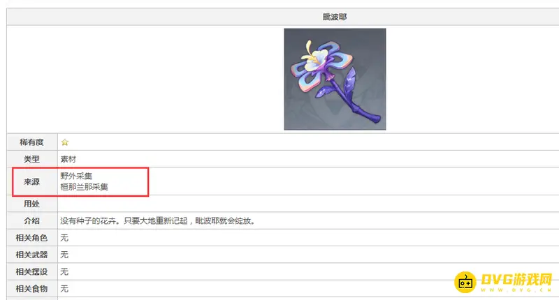 原神毗波耶可以在桓那兰那采集。在原神游戏中,毗波耶是稀有度为一星的素材,介绍:没有种子的花卉。只要大地重新记起,毗波耶就会绽放。