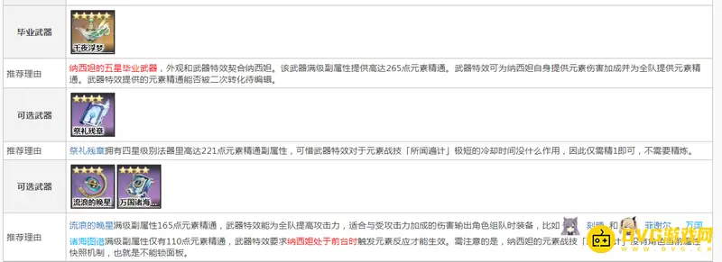纳西妲的专武是千夜浮梦,该武器满级副属性提供高达265点元素精通。除了千夜浮梦,祭礼残章、流浪的晚星以及万国诸海图谱等四星武器也能增加元素精通。