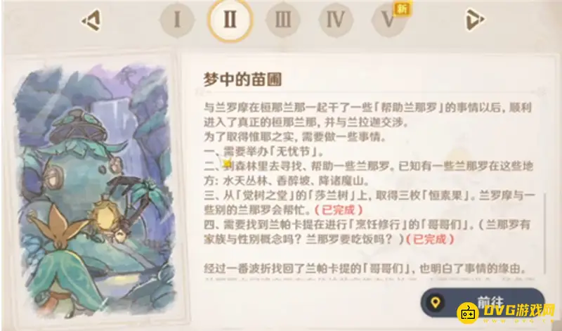 首先与兰那罗一同冒险任务,对应的是森林书梦中的苗圃的四个小任务,只有把这四个小任务完成后,才能完成与兰那罗一同冒险的任务。(PS:打开背包-任务道具-阅读森林书即可查看。),要按照顺序把任务完成后才行,在将这些任务全部完成后,与兰那罗一同冒险也就跟着完成了。总而言之,由于这个任务实际上是很多个小任务,所以也不方便给出指引,需要旅行者自己找到七天神像附近的这些兰那罗来触发任务。