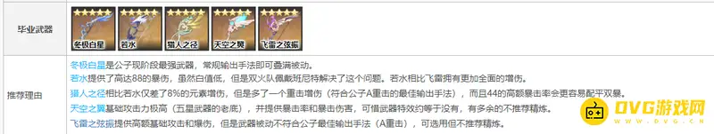 猎人之径相比若水仅差了8%的元素增伤,但是多了一个重击增伤(符合公子A重击的最佳输出手法),而且44的高额暴击率会更容易配平双暴。天空之翼基础攻击力极高(五星武器的老底),并提供暴击率和暴击伤害,可惜武器特效约等于没有,有多余的不推荐精炼。