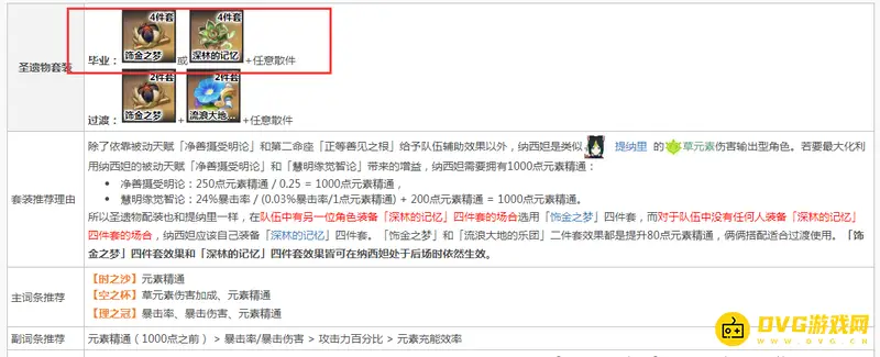纳西妲的圣遗物配装也和提纳里一样,在队伍中有另一位角色装备「深林的记忆」四件套的场合选用「饰金之梦」四件套,而对于队伍中没有任何人装备「深林的记忆」四件套的场合,纳西妲应该自己装备「深林的记忆」四件套。