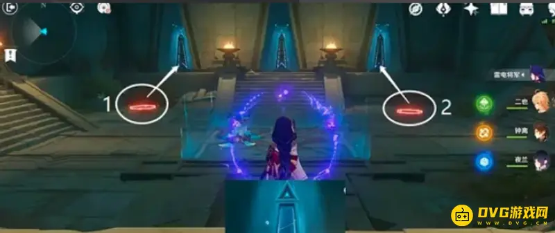 打开开关1号,旋转对应的方碑到图中图案并且发光,之后关闭开关1,打开开关2,也是旋转对应方碑到图中图案并且发光,等待中间石碑自动旋转并发光。