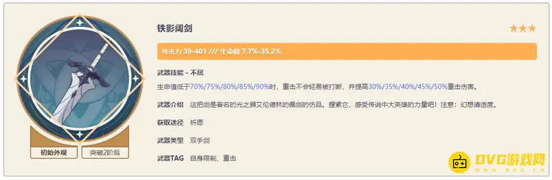 铁影阔剑武器被动初始数值为50%/35%,选择它是因为武器自带的被动技能能够大幅提升战斗女仆重击的输出,开启必杀技以后诺艾尔自身增幅了攻击力,在爆发期间可以造成较为可观的伤害。