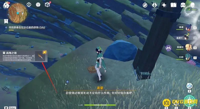 2、到达位置后可以在柱子旁看到一个鸟巢,靠近并调查鸟巢后就能拿到第一个供物-高翔之翎。