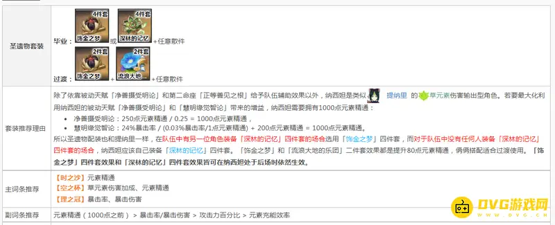 选择理由:纳西妲圣遗物配装也和提纳里一样,在队伍中有另一位角色装备「深林的记忆」四件套的场合选用「饰金之梦」四件套,而对于队伍中没有任何人装备「深林的记忆」四件套的场合,纳西妲应该自己装备「深林的记忆」四件套。「饰金之梦」和「流浪大地的乐团」二件套效果都是提升80点元素精通,俩俩搭配适合过渡使用。「饰金之梦」四件套效果和「深林的记忆」四件套效果皆可在纳西妲处于后场时依然生效。