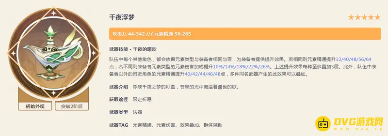 纳西妲的五星毕业武器,外观和武器特效契合纳西妲。该武器满级副属性提供高达265点元素精通。武器特效可为纳西妲自身提供元素伤害加成并为全队提供元素精通。