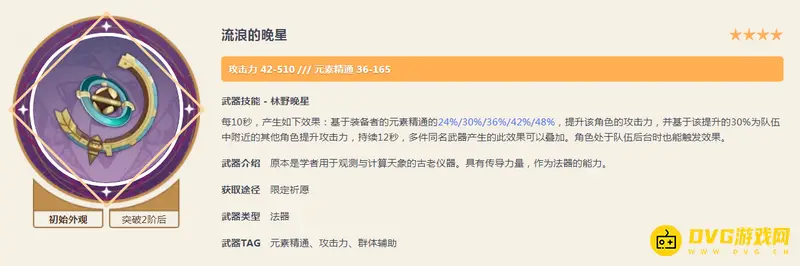 流浪的晚星满级副属性165点元素精通,武器特效能为全队提高攻击力,适合与受攻击力加成的伤害输出角色组队时装备,比如刻晴和菲谢尔 。