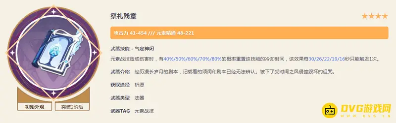 祭礼残章拥有四星级别法器里高达221点元素精通副属性,可惜武器特效对于元素战技「所闻遍计」极短的冷却时间没什么作用,因此仅需精1即可,不需要精炼。