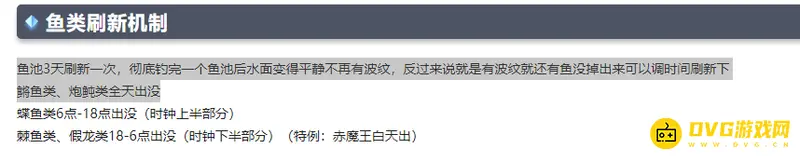全天出没,鱼池3天刷新一次,彻底钓完一个鱼池后水面变得平静不再有波纹,反过来说就是有波纹就还有鱼没掉出来可以调时间刷新下,鳉鱼类、炮鲀类全天出没,蝶鱼类6点-18点出没(时钟上半部分),棘鱼类、假龙类18-6点出没(时钟下半部分)(特例:赤魔王白天出)。