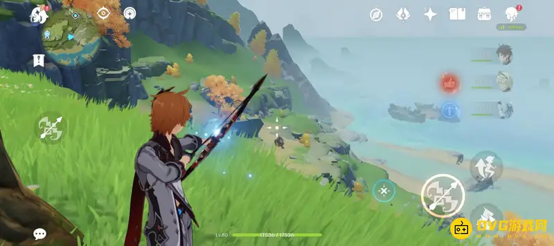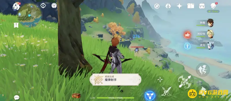3、接着切换出弓箭手角色进行蓄力射击,将准星对准丘丘岩盔王偏上的位置,由于距离较远,因此即便玩家第一次没有击中要害,岩盔王受到攻击站起来的话也不会移动位置,玩家可以在这个点位多试几次。