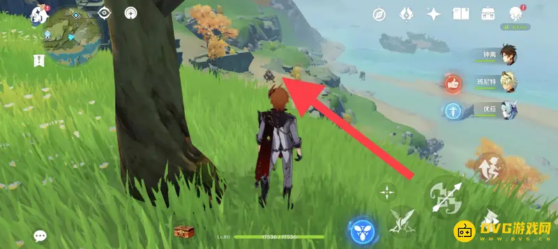 2、到达位置后看向东方向可以看到一个丘丘岩盔王,因为这个怪物的体型较大,所以站在山壁上就可以保证视野足够看到它。