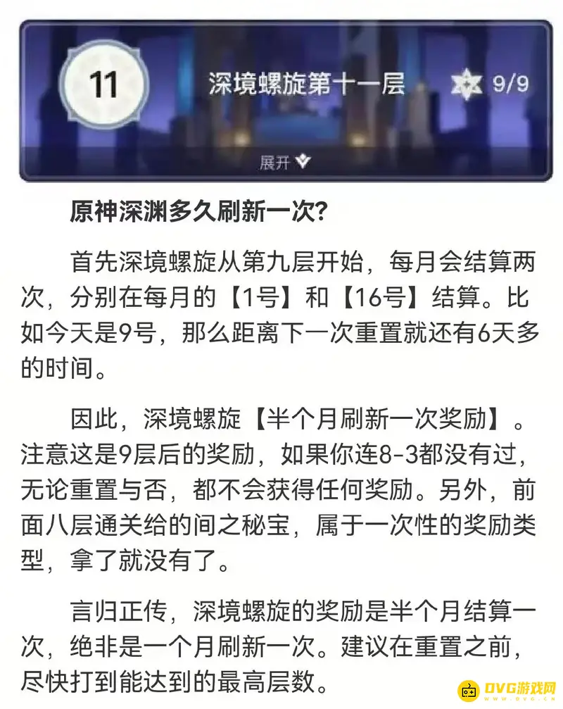 深渊的中的怪物每过一个版本就会换一次,而每个版本大约为42天,更新的同时深境螺旋中的整体buff也会随之改变。原神深渊半个月刷新一次,分别在每月的1号和16号结算,比如今天是9号,那么距离下一次重置就还有6天多的时间,建议在重置之前,尽快打到能达到的最高层数。