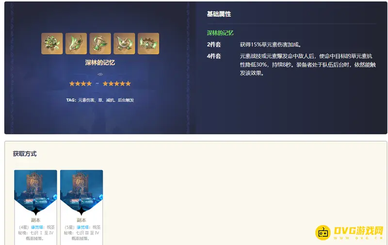 (4星)缘觉塔:祝圣秘境:七识Ⅰ至Ⅳ概率掉落。(5星)缘觉塔:祝圣秘境:七识Ⅲ至Ⅳ概率掉落。2件套:获得15%草元素伤害加成。4件套:元素战技或元素爆发命中敌人后,使命中目标的草元素抗性降低30%,持续8秒。装备者处于队伍后台时,依然能触发该效果。