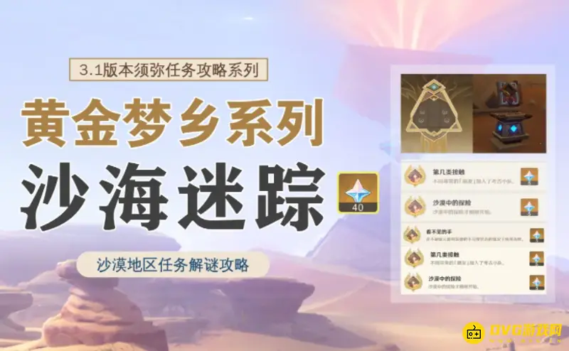 原神3.1版本的沙海迷踪任务任务入口找寻方法:1.我们先来沙漠的阿如村,找到我们的NPC博尼法兹,与其交谈,开启任务。2.根据任务的指引,我们需要在沙漠神像处开启,找到沙漠旅团的脚印,随后找到他们。3.不断追随他们的脚印,来到一处大坑处,我们往下跳。最后与NPC对话完成就可以进入沙海地图了。