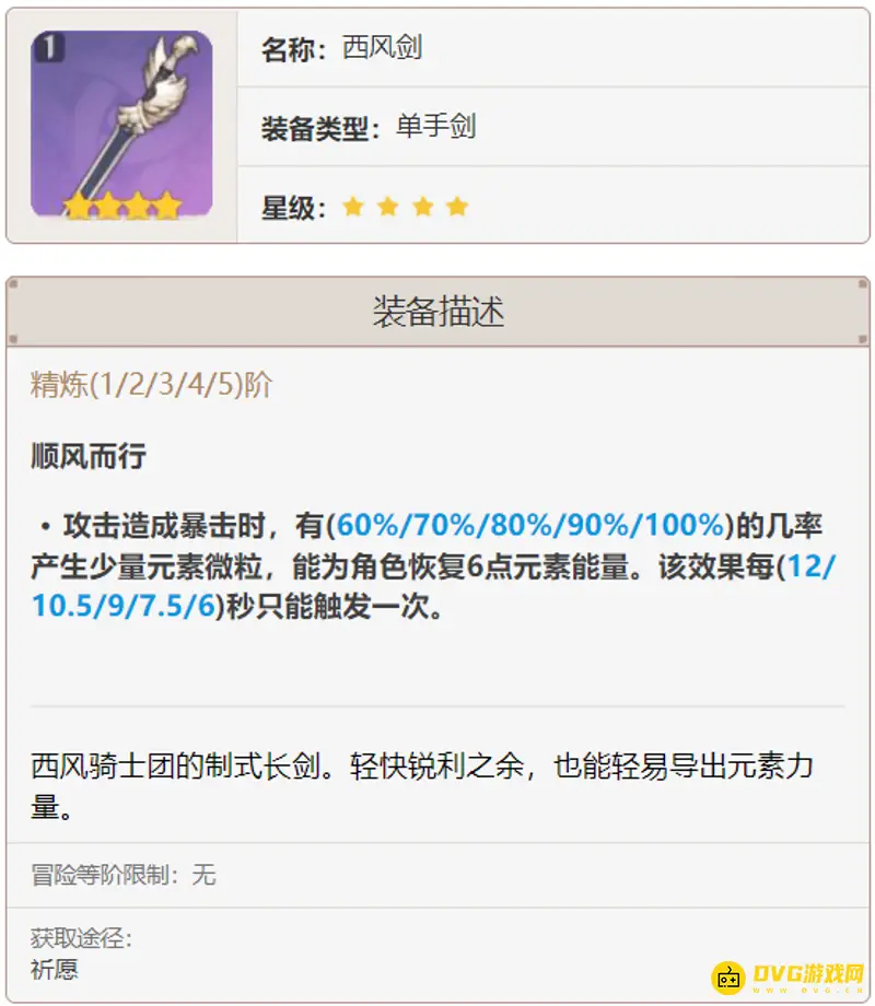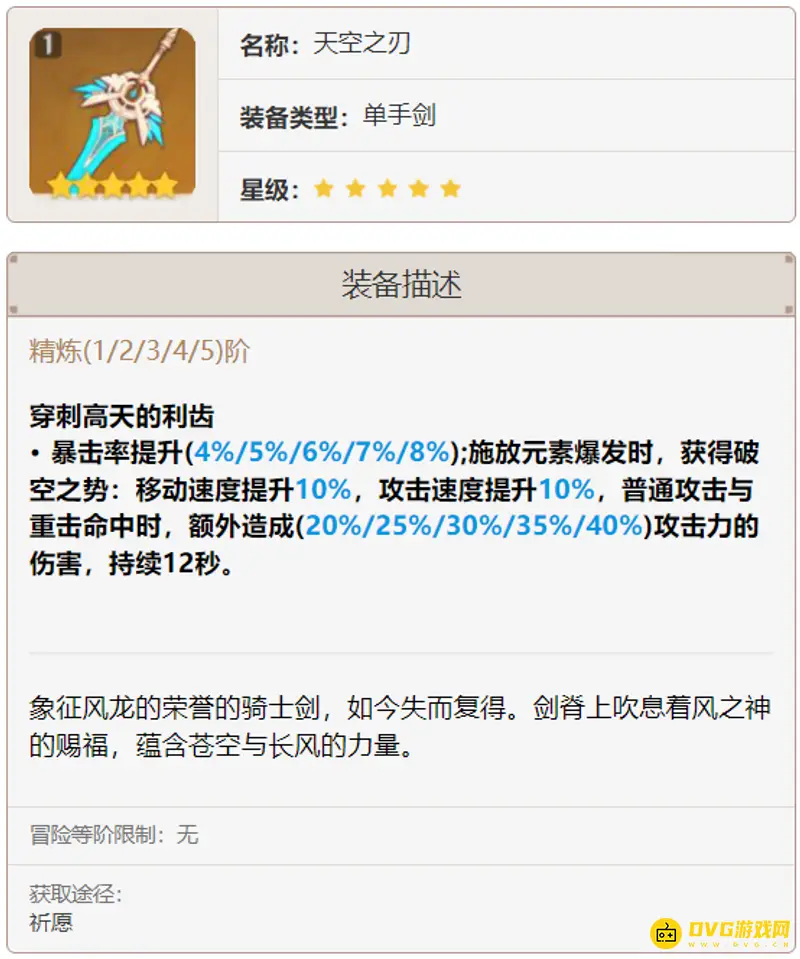 天空之刃:天空单手剑又称“痛苦剑”,是五星武器中适应性较低的,在常驻池有,容易被歪到,天空单手剑也叫痛苦单手剑。副词条是元素充能,给主C没啥用,倒是非常适合班尼特。