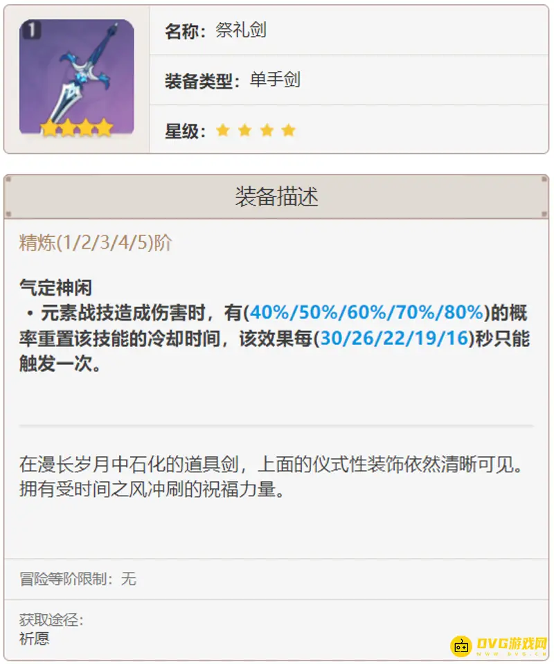 祭礼剑:祭礼剑的攻击力白值和元素充能效率跟西风剑完全一样,白值都不算高,但是充能效率加成非常不错。除了武器自身的属性加成之外,祭礼剑的技能也很有特点:元素战技造伤害时,有概率重置该技能的冷却时间,也就是班尼特的元素战技可以时不时的重置冷却,虽然伤害提升很小,但是这为整个队伍的技能循环的帮助是非常大的。